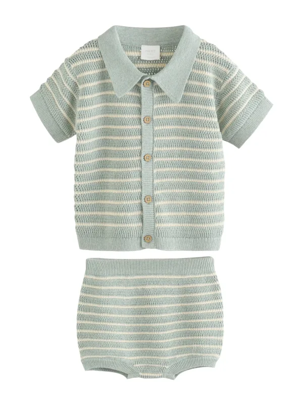Design: Knop placket, Geribd ceintuurtje; Materiaal: Knitwear; Motief: Gestreept; Extra's: All-over patroon, Label patch/label flag; Aantal per set: 2-delig; Lengte: Kort/mini; Armlengte: Kwartmouw