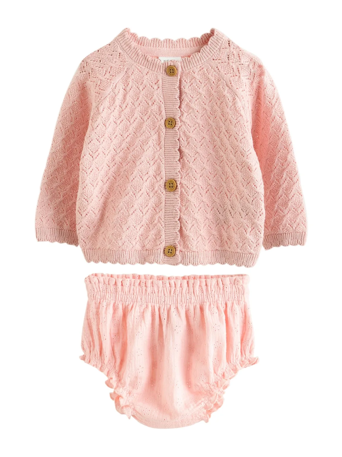 Design: Geschulpte zoom; Materiaal: Katoen; Motief: Effen; Extra's: Voelt zacht aan; Aantal per set: 2-delig; Lengte: Kort/mini; Setinhalt Kleidung: Strickjacke, Hose; Pasvorm: Normale pasvorm; Armlengte: Lange mouw
