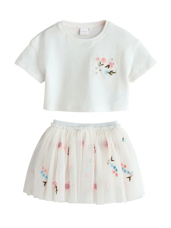 Design: Overcut schouder; Materiaal: Jersey, Tule; Motief: Bloemenprint; Extra's: Applicaties; Aantal per set: 2-delig; Lengte: Kort/mini; Setinhalt Kleidung: Rock, Shirt; Pasvorm: Normale pasvorm; Armlengte: Kwartmouw
