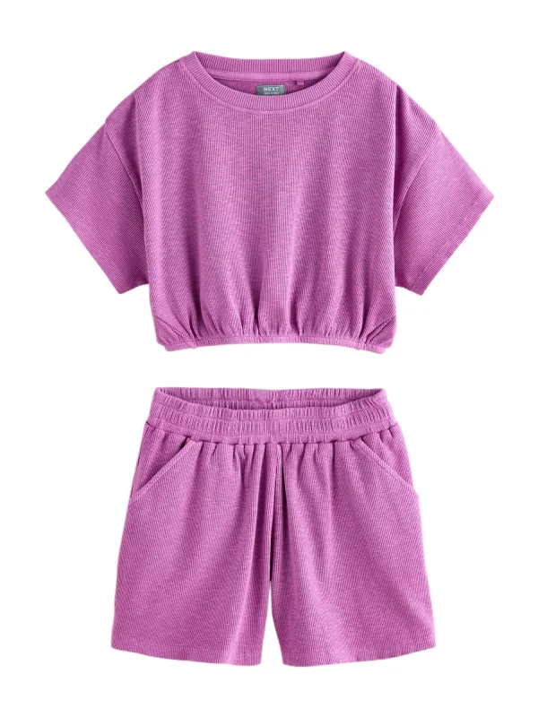 Design: Elastische taille/zoom, Zakken aan de zijkant; Materiaal: Jersey; Motief: Mélange; Extra's: Met textuur, Voelt zacht aan; Aantal per set: 2-delig; Lengte: Kort/mini; Setinhalt Kleidung: Shirt, Hose; Pasvorm: Losse pasvorm; Armlengte: Kwartmouw