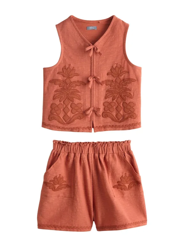 Design: Elastische taille/zoom; Materiaal: Katoen; Motief: Bloemenprint; Extra's: Applicaties, Met textuur; Aantal per set: 2-delig; Lengte: Kort/mini; Pasvorm: Normale pasvorm; Armlengte: Mouwloos