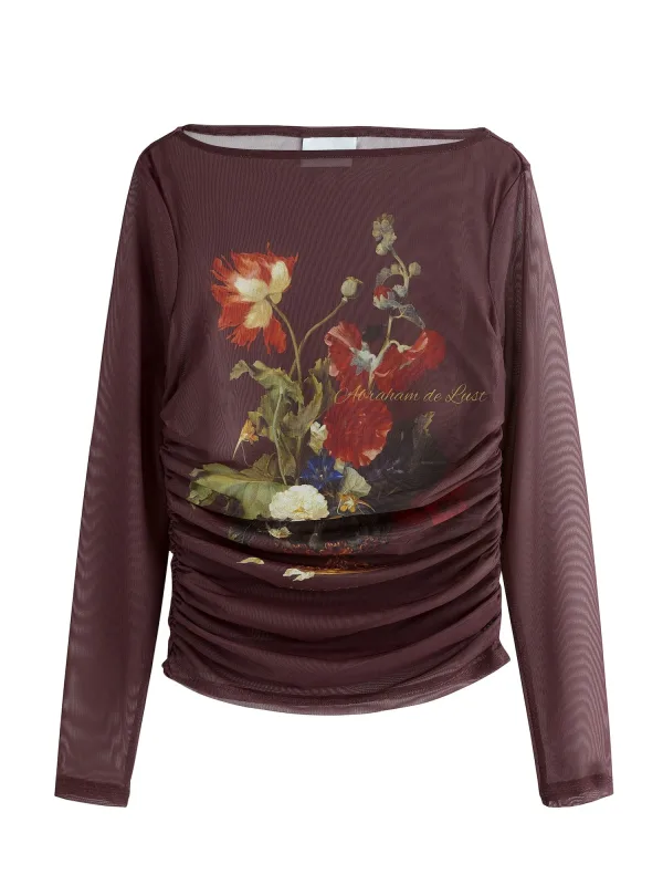 Blouse type: Blouseshirt; Design: Gevoerde zoom/rand; Materiaal: Gerecycled materiaal; Halstype: Boothals; Motief: Bloemenprint; Kraag: Zonder kraag; Details: Gedrapeerd; Extra's: Lichte stof; Pasvorm: Slanke pasvorm; Armlengte: Lange mouw; Lengte: Normale lengte