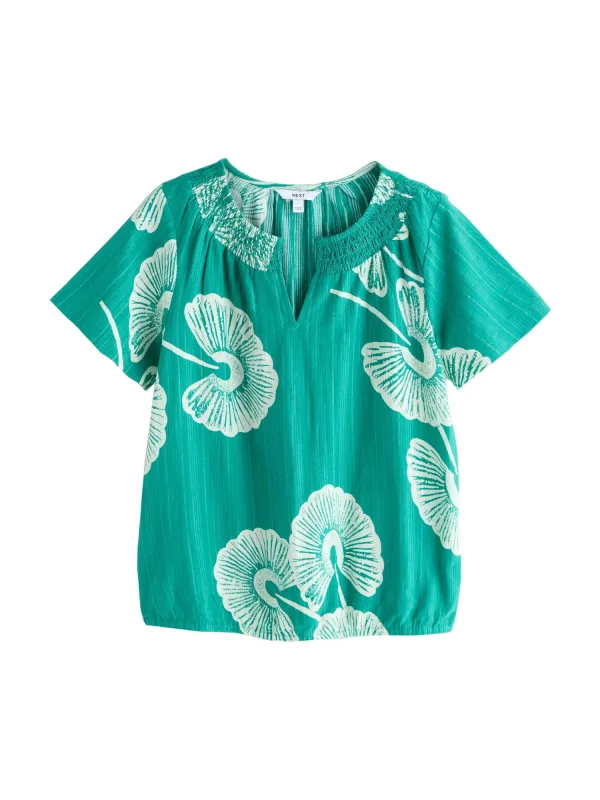 Blouse type: Blouseshirt; Design: Elastische taille/zoom; Materiaal: Katoen; Motief: Bloemenprint; Kraag: Tuniek kraag; Details: Gedrapeerd; Extra's: All-over patroon; Pasvorm: Losse pasvorm; Armlengte: Kwartmouw; Lengte: Normale lengte