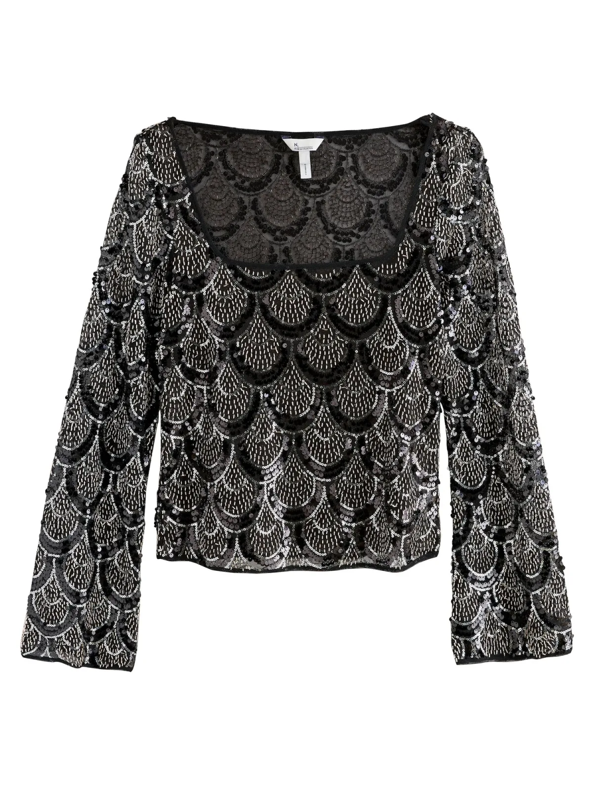 Design: Rechte zoom, Trompetmouwen; Halstype: Carréhals; Details: Pailletten; Extra's: Glanzend, Met kristalparels/glazen parels; Pasvorm: Normale pasvorm; Armlengte: Lange mouw; Lengte: Normale lengte