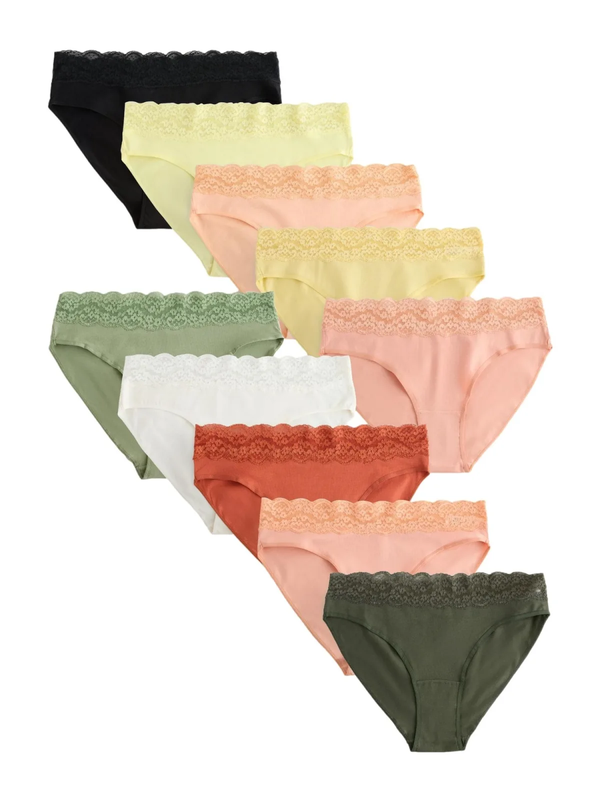Design: Ingelegde zoom/rand, Zoom/rand met boord, Geschulpte zoom; Materiaal: Jersey; Motief: Bloemenprint; Details: Kant; Extra's: Op staal naden, Voelt zacht aan; Aantal: 10 Pack; Taillehoogte: High waist