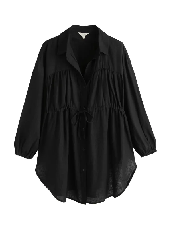 Design: Gevoerde zoom/rand, Knop placket, Pofmouwen, Overcut schouder; Type sluiting: Knoopsluiting; Materiaal: Linnen; Motief: Effen; Details: Plooien, Gedrapeerd; Extra's: Licht transparant, Op staal naden, Voelt zacht aan; Lengte: Kort/mini; Pasvorm: Losse pasvorm; Armlengte: Lange mouw