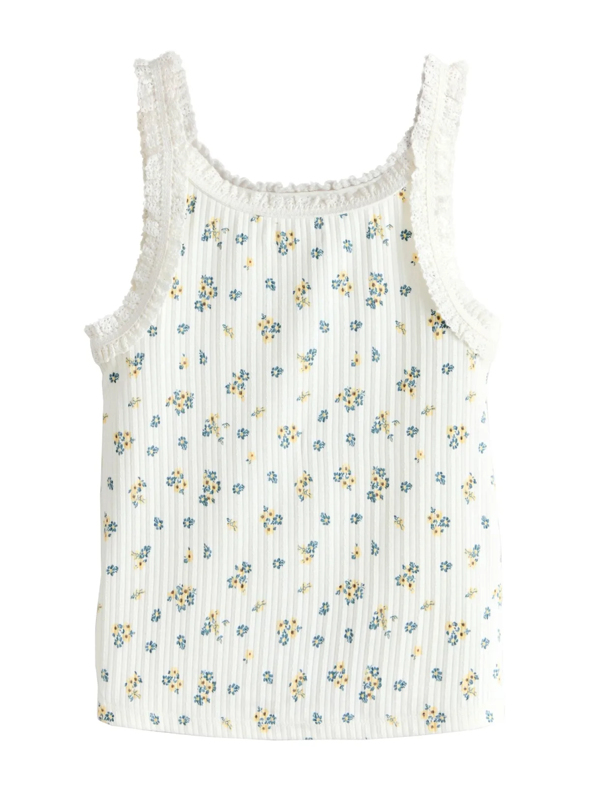 Design: Gevoerde zoom/rand; Materiaal: Jersey; Halstype: Ronde hals; Motief: Bloemenprint; Soort bandjes: Normale bandjes; Details: Ruches, Kant; Extra's: All-over patroon; Pasvorm: Normale pasvorm; Armlengte: Mouwloos; Lengte: Normale lengte