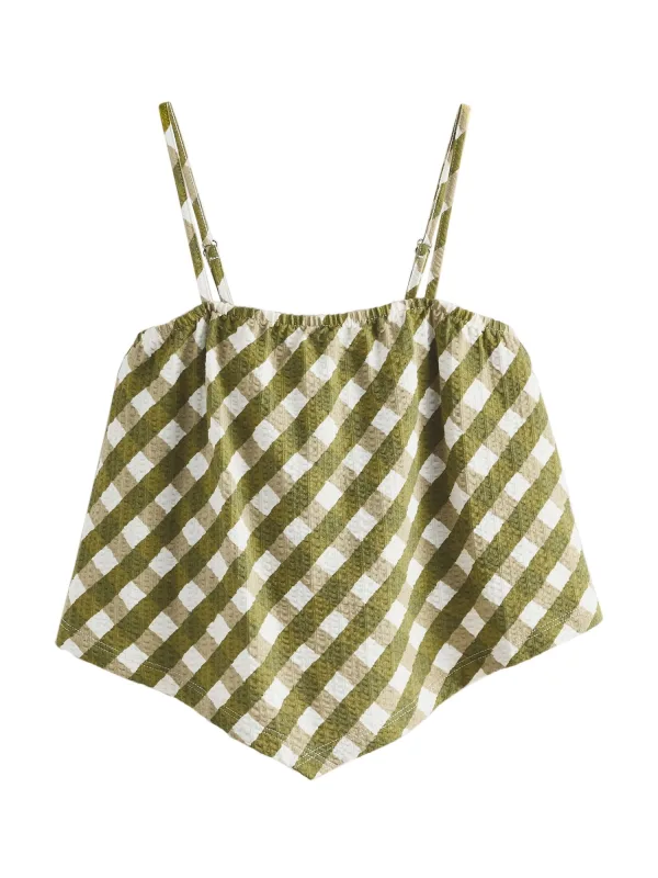 Design: Gevoerde zoom/rand; Materiaal: Katoen; Halstype: Carréhals; Motief: Geruit; Soort bandjes: Spaghettibandjes; Details: Gedrapeerd; Extra's: Verstelbare bandjes, All-over patroon; Pasvorm: Losse pasvorm; Armlengte: Mouwloos; Lengte: Korte pasvorm