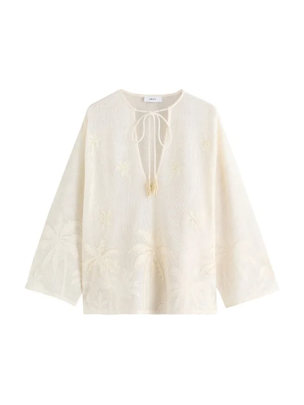 Design: Om te knopen/binden; Materiaal: Knitwear; Halstype: Uitgesneden hals; Motief: Bloemenprint; Details: Borduursels; Extra's: Fully fashioned; Pasvorm: Losse pasvorm; Armlengte: Lange mouw; Lengte: Normale lengte