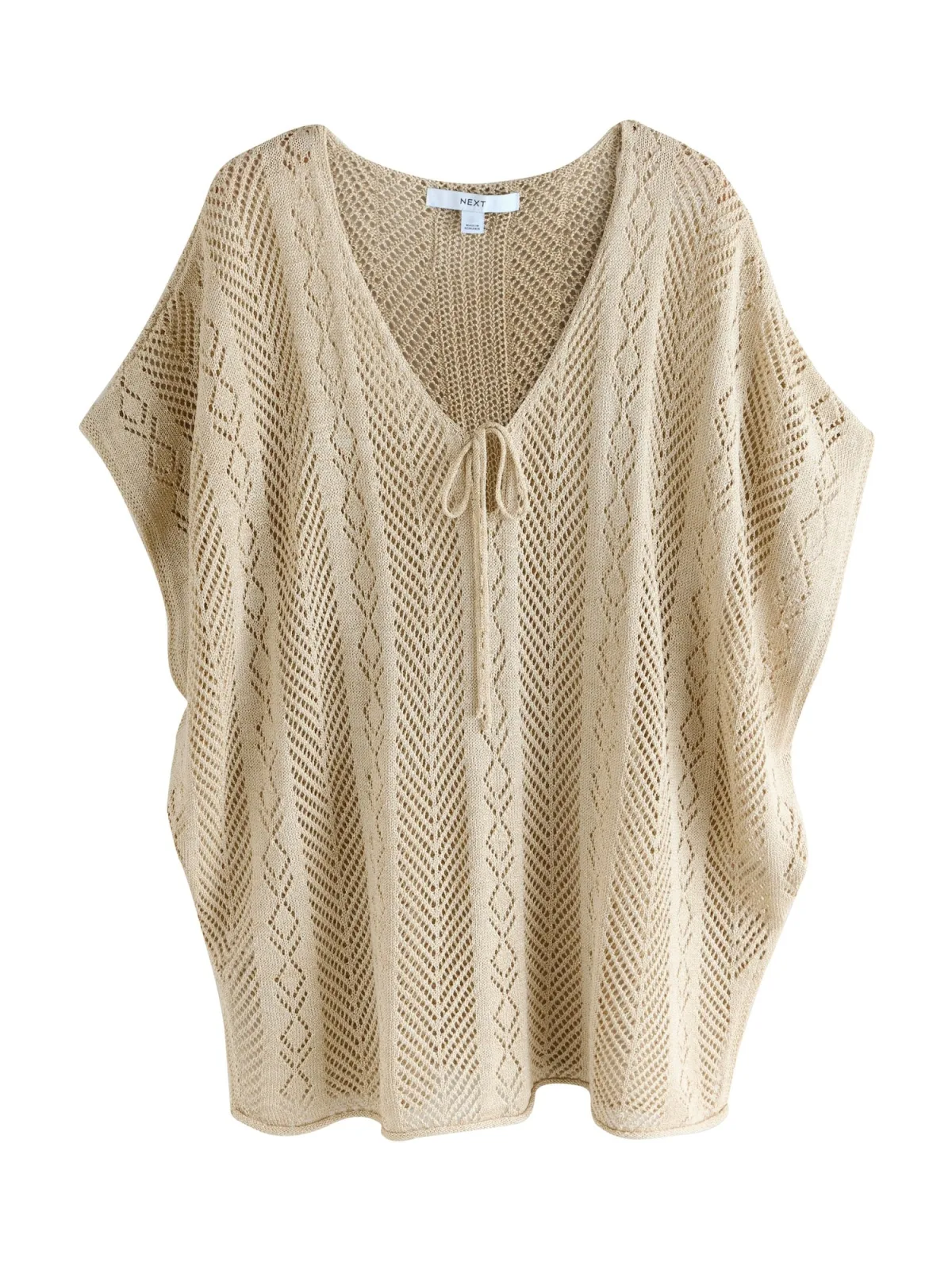 Design: Gesneden mouw; Materiaal: Knitwear; Halstype: V-hals; Motief: Effen; Details: Mesh; Extra's: Visnet brei; Pasvorm: Wijde pasvorm; Armlengte: Kwartmouw; Lengte: Lange pasvorm