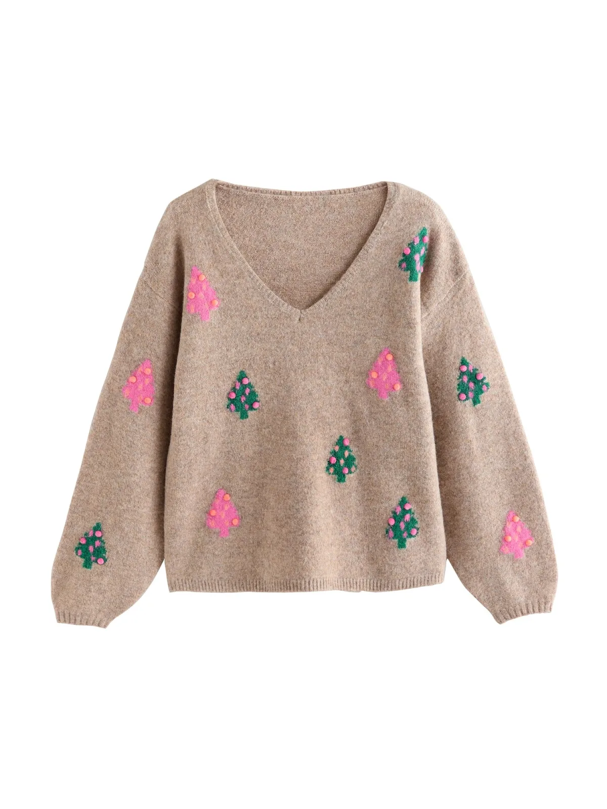 Design: Geribbelde kraag, Geribd ceintuurtje, Overcut schouder, Kerstdesign; Materiaal: Gerecycled materiaal; Halstype: V-hals; Motief: Motiefprint; Extra's: Applicaties, Met textuur; Pasvorm: Losse pasvorm; Armlengte: Lange mouw; Lengte: Normale lengte