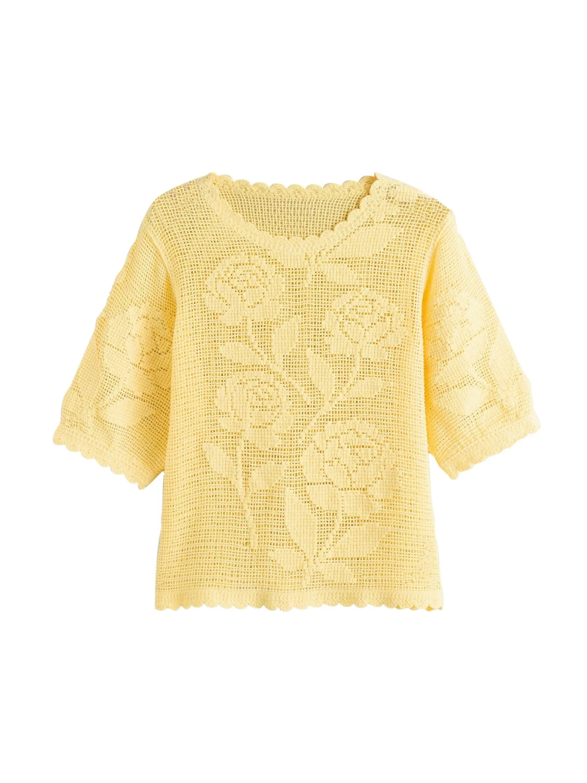 Materiaal: Knitwear; Halstype: Ronde hals; Motief: Bloemenprint; Details: Mesh; Pasvorm: Normale pasvorm; Armlengte: Halve mouw; Lengte: Normale lengte