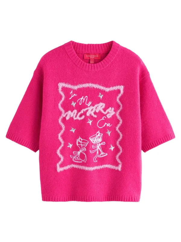 Design: Geribd ceintuurtje; Materiaal: Gerecycled materiaal; Halstype: Ronde hals; Motief: Tekst print; Extra's: Kerstdesign; Pasvorm: Normale pasvorm; Armlengte: Driekwart mouw; Lengte: Normale lengte
