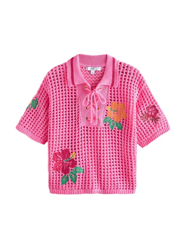 Blouse type: Blouseshirt; Design: Vetering; Type sluiting: Snoersluiting; Materiaal: Knitwear; Halstype: Polokraag; Motief: Bloemenprint; Details: Borduursels, Mesh; Extra's: Label patch/label flag, Voelt zacht aan; Pasvorm: Normale pasvorm; Armlengte: Kwartmouw; Lengte: Normale lengte