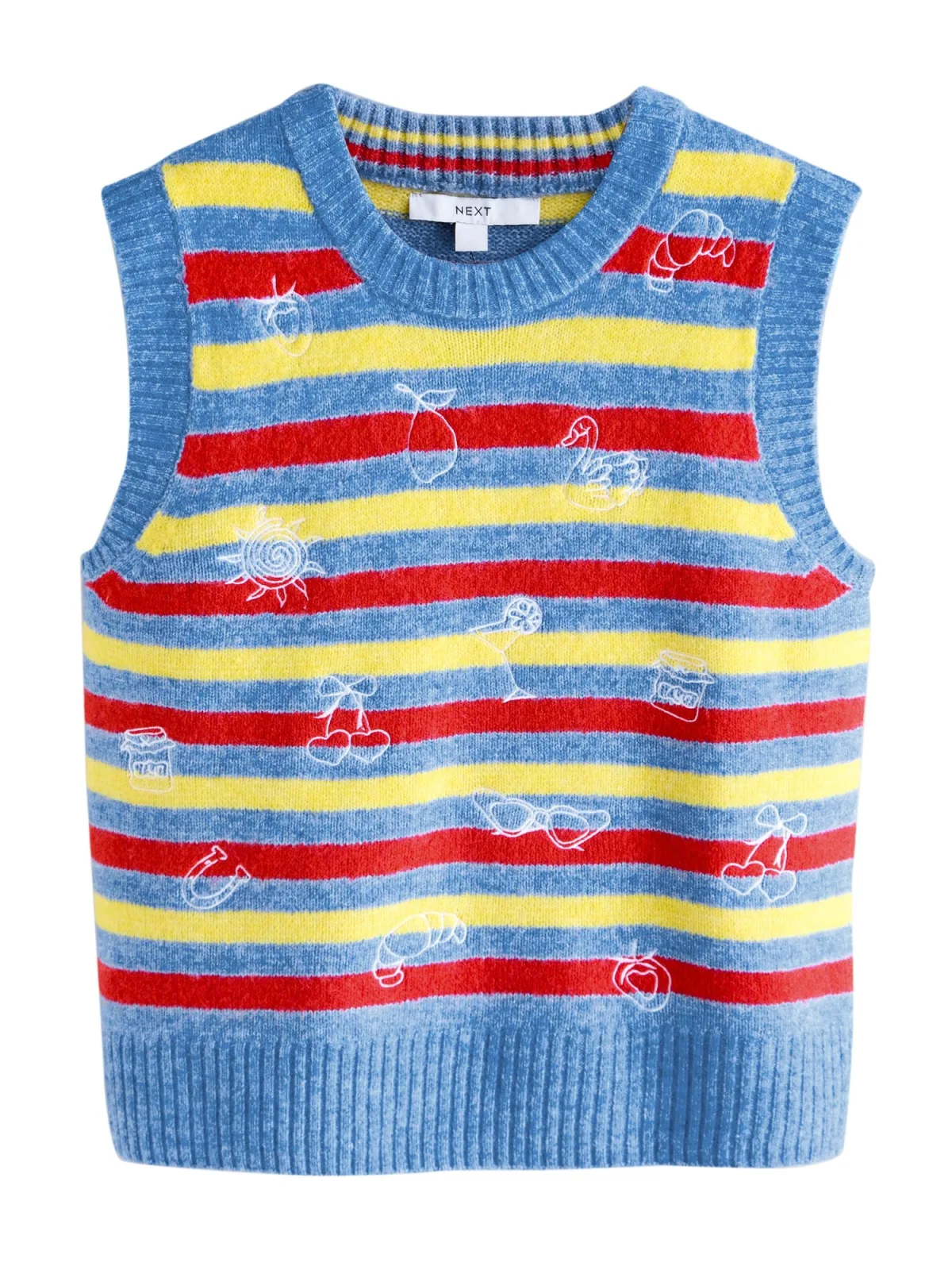 Design: Geribbelde kraag, Rechte zoom, Geribd ceintuurtje; Materiaal: Knitwear; Halstype: Ronde hals; Motief: Gestreept; Extra’s: All-over patroon, Fully fashioned, Voelt zacht aan; Pasvorm: Normale pasvorm; Armlengte: Mouwloos; Lengte: Normale lengte