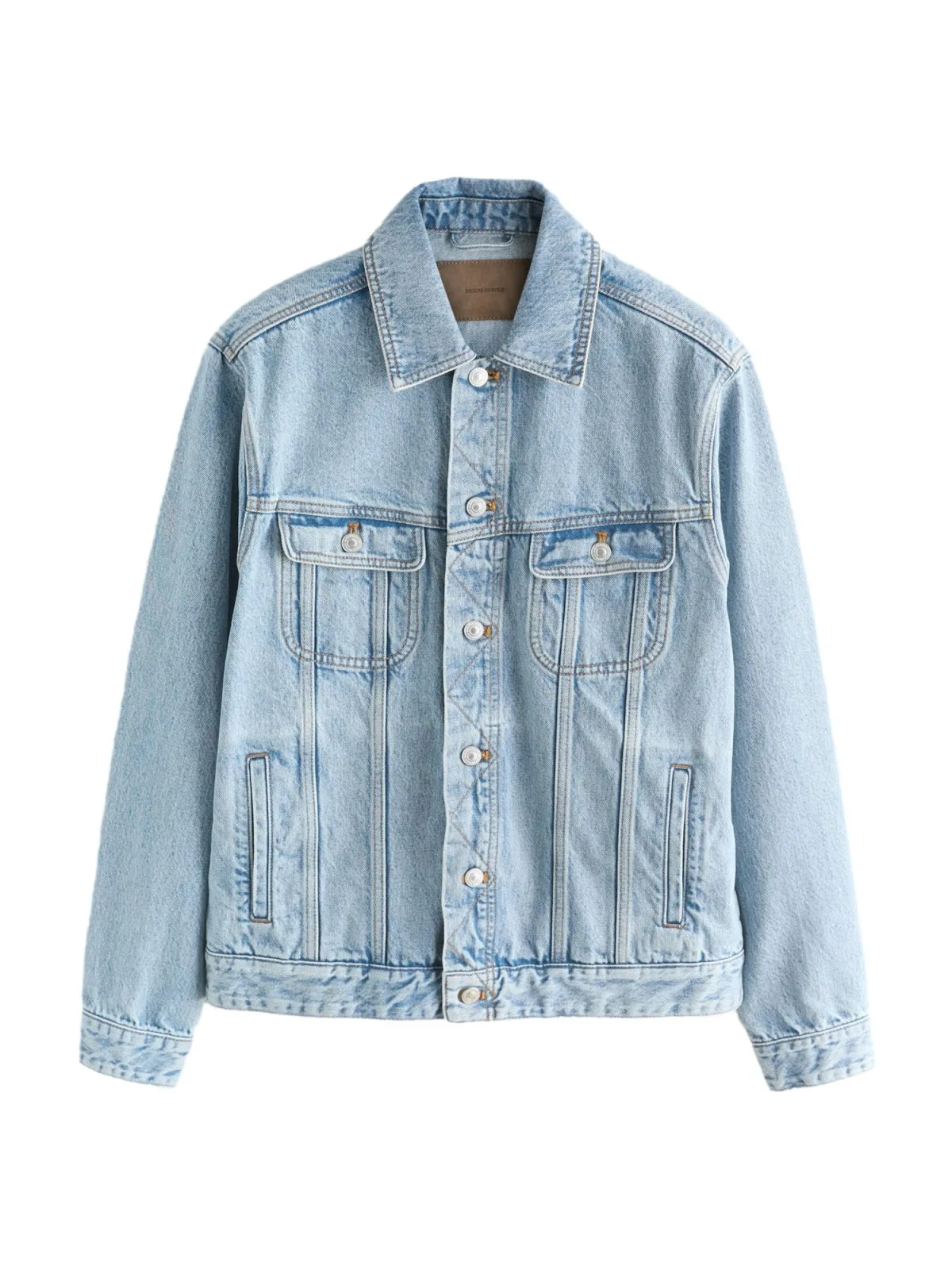 Design: Knop placket, Borstzak, Zakken aan de zijkant; Type sluiting: Knoopsluiting; Voering: Niet gevoerd; Materiaal: Denim; Motief: Effen; Extra's: Op staal naden, Gewassen effect; Pasvorm: Normale pasvorm
