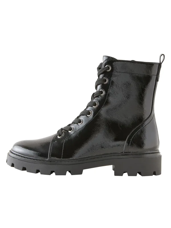 Design: Profielzolen, Versterkte hak, Vetering met 8 gaten, Hielband; Type hak: Blokhak; Motief: Effen; Materiaal: Imitatieleer; Schoenneus: Ronde neus; Extra's: Glanzend, Flexibele zool, Metalen oogjes; Hakhoogte: Platte hak (0-3 cm)