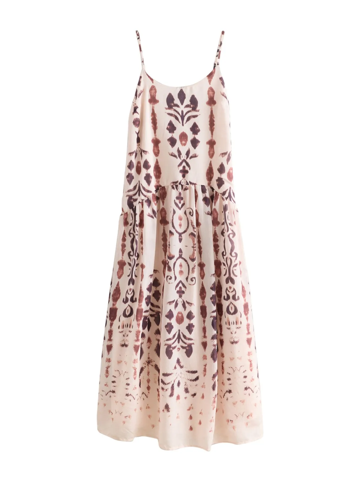 Design: Gevoerde zoom/rand; Halstype: Ronde hals; Soort bandjes: Spaghettibandjes; Details: Gedrapeerd; Extra's: All-over patroon; Lengte: 7/8 lengte; Snit: Uitlopend; Pasvorm: Normale pasvorm; Armlengte: Mouwloos