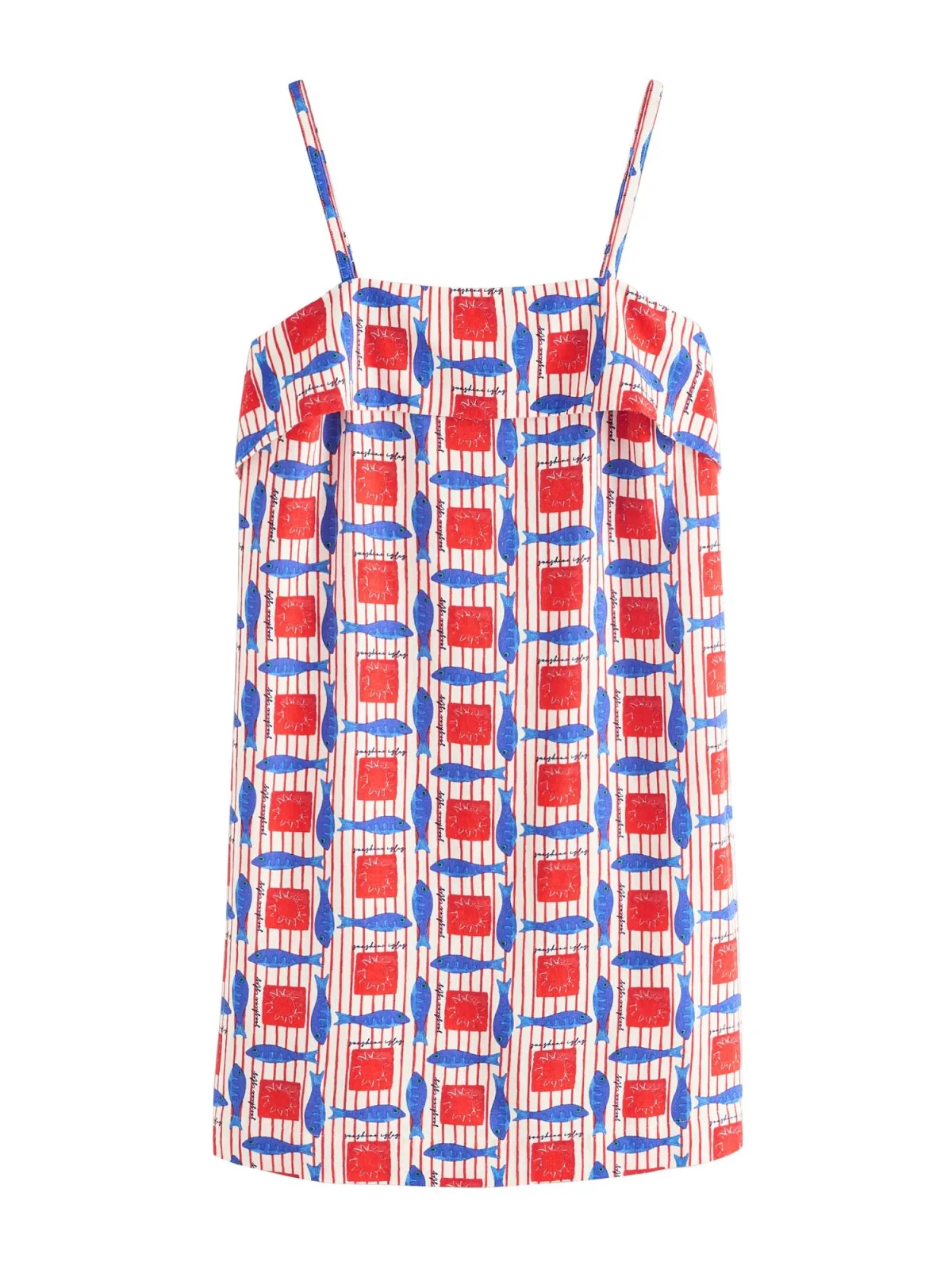 Design: Gevoerde zoom/rand; Type sluiting: Ritssluiting; Materiaal: Viscose; Halstype: Carréhals; Soort bandjes: Spaghettibandjes; Extra’s: All-over patroon, Koele grip; Lengte: Kort/mini; Snit: Recht; Pasvorm: Normale pasvorm; Armlengte: Mouwloos