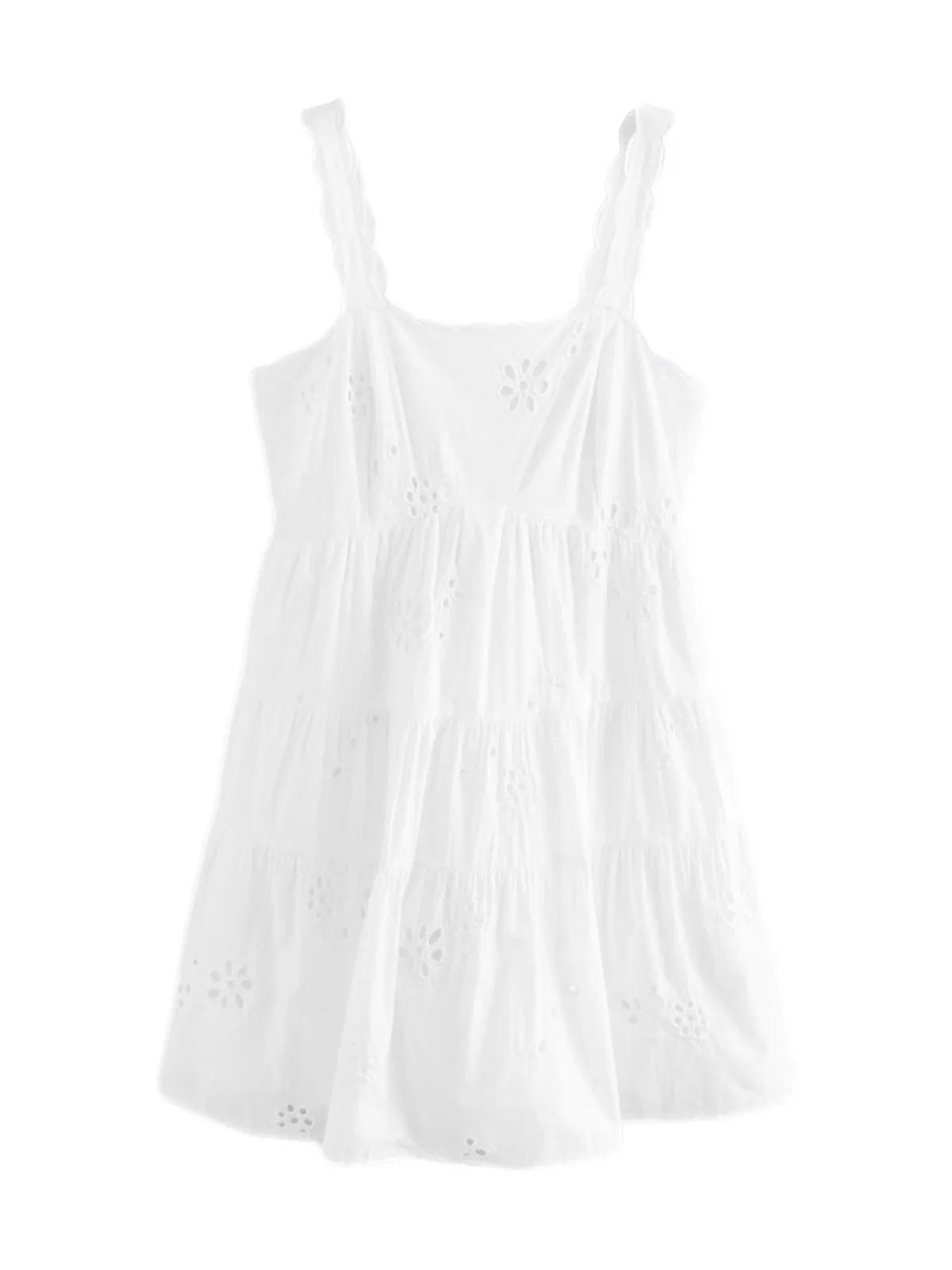 Design: Gevoerde zoom/rand; Materiaal: Katoen; Halstype: Carréhals; Motief: Effen; Soort bandjes: Normale bandjes; Details: Borduursels, Volant, Gedrapeerd; Extra's: Op staal naden; Lengte: Kort/mini; Snit: Getailleerd; Pasvorm: Normale pasvorm; Armlengte: Mouwloos