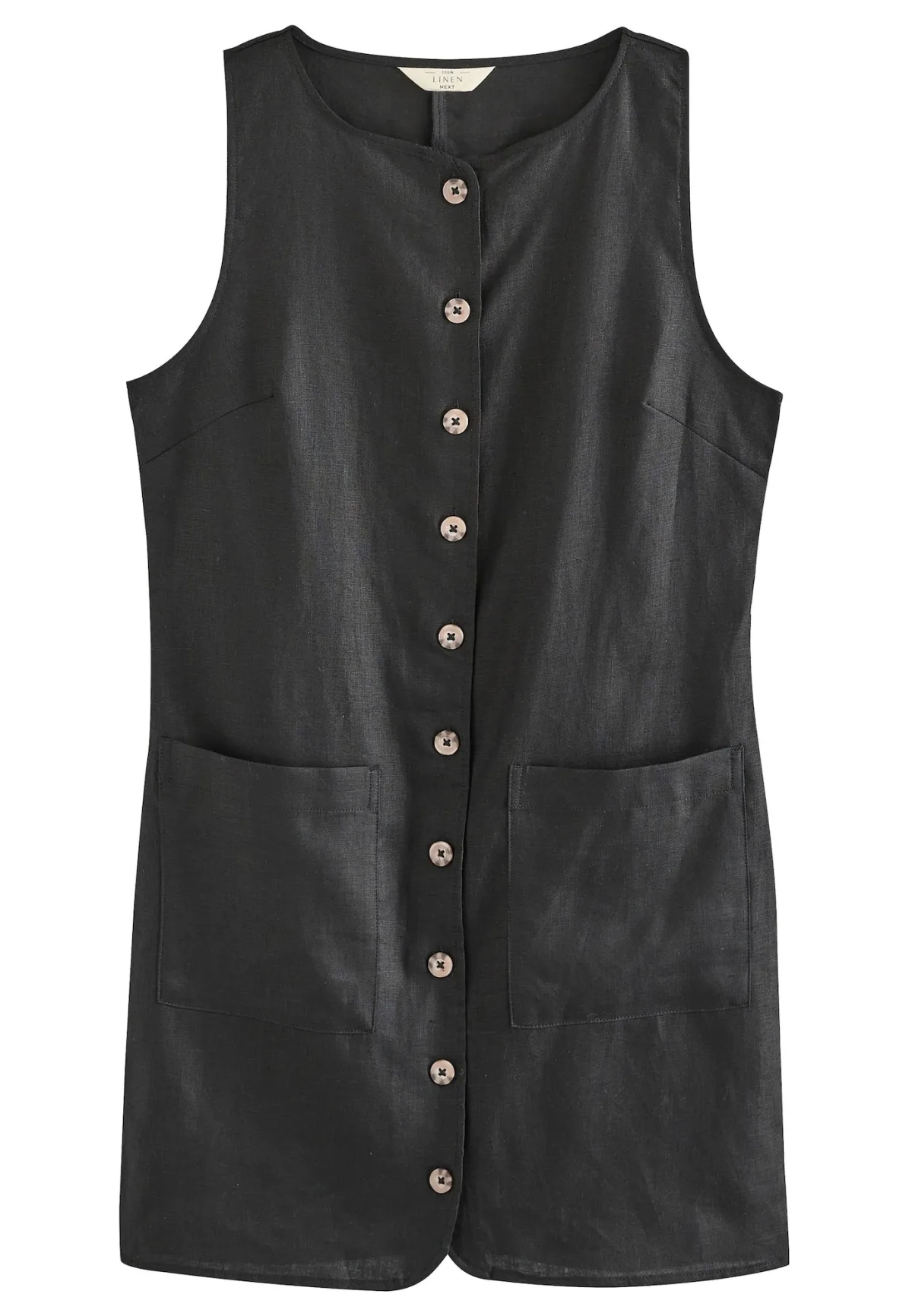 Design: Opgezette zakken; Type sluiting: Knoopsluiting; Materiaal: Linnen; Halstype: Ronde hals; Motief: Effen; Soort bandjes: Brede bandjes; Extra's: Op staal naden; Lengte: Kort/mini; Snit: Recht; Pasvorm: Slanke pasvorm; Armlengte: Mouwloos