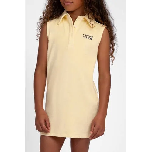 Deze lichtgele meisjes jurk van NIK&NIK is een frisse, comfortabele keuze voor zonnige dagen. De combinatie van een polokraag en mouwloos model geeft een sportieve uitstraling, terwijl de A-lijn vorm soepel om het lichaam valt. De zachte badstof kwaliteit voelt prettig aan op de huid, ideaal voor school, vakantie of een dagje uit.Licht en luchtig ontwerp voor iedere dag Mouwloos model dat veel bewegingsvrijheid geeft, fijn op warme dagen Polokraag met knoopsluiting voor een nette, sportieve look A-lijn pasvorm die comfortabel zit en makkelijk meebeweegt Effen gele kleur die makkelijk te combineren is met sneakers of sandalen Totale lengte: 63 cm, geschikt voor schoolkind en tiener Zachte badstof structuur voor een comfortabele touchComfortabel in de klas en daarbuitenDeze jurk is een praktische keuze voor drukke dagen. De knoopsluiting aan de voorkant maakt aan- en uittrekken eenvoudig, ook voor kinderen zelf. De langere top en kortere rok vallen samen tot een korte jurk die netjes blijft zitten tijdens spelen, fietsen of in de klas zitten. Het model op de foto is 145 cm en draagt maat 140, wat helpt bij het inschatten van de lengte.NIK&NIK voor moderne kindermodeNIK&NIK staat bekend om kinderkleding met een moderne, stadse uitstraling. De collecties sluiten aan bij wat kinderen zelf graag dragen, met aandacht voor pasvorm en eigentijdse details. Zo combineert NIK&NIK trends met praktische ontwerpen die geschikt zijn voor alledaags gebruik.Een lichtgele zomerfavoriet die er verzorgd uitziet en toch heel relaxed draagt.