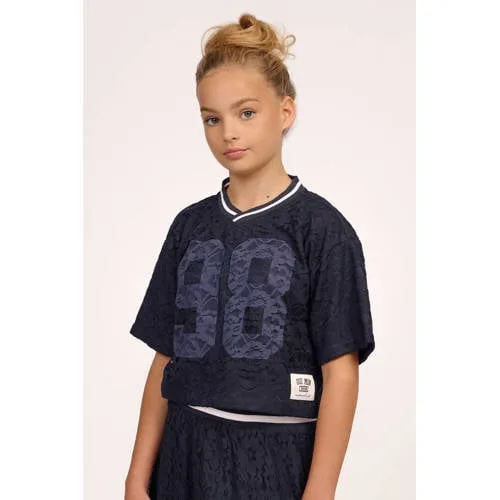 Dit donkerblauwe donkerblauw meisjes T-shirt van NIK&NIK geeft elke outfit een sportieve en trendy uitstraling. Het korte, cropped model valt net boven de heup en sluit mooi aan op een hoge jeans, rok of sportieve jogger. De V-hals en rechte mouwen zorgen voor een frisse look, terwijl de printopdruk en kanten details het T-shirt een opvallend karakter geven. Gemaakt van een zachte katoenmix voelt het comfortabel aan op de huid, ideaal voor schooldagen en vrije tijd.Details die het verschil maken Kleur donkerblauw, makkelijk te combineren met andere basics Cropped lengte met een totale lengte van 43 cm voor een moderne pasvorm V-hals en korte mouwen met rechte inzet voor een sportieve look Printopdruk op de voorkant met subtiele kanten details Gemaakt van een zachte katoenmix die prettig aanvoelt Wasbaar op 30 graden, waardoor de stof en kleur lang mooi blijven Model is 151 cm en draagt maat 140, handig als referentieVoor school, sport en vrije tijdHet T-shirt past goed bij de sporty en varsity trend uit de collectie. Draag het met een hoge jeans en sneakers naar school, of combineer het met een comfortabele sweatshort op een vrije dag. De cropped lengte geeft elke outfit een eigentijdse twist.NIK&NIK voor kids met stijlNIK&NIK staat bekend om kindermode met een moderne, stoere en toch toegankelijke uitstraling. De collectie is ontworpen met oog voor detail en pasvorm, zodat meisjes zich de hele dag vrij kunnen bewegen en er tegelijkertijd verzorgd uitzien.Een eigentijds T-shirt dat een vaste favoriet in de kast wordt.