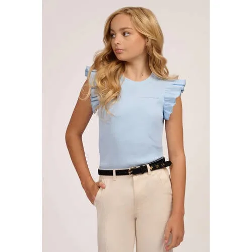 Dit lichtblauwe meisjes T-shirt van NIK&NIK is een basic met een moderne twist. De rib gebreide stof sluit mooi aan, terwijl de zachte stretchkatoen comfortabel aanvoelt op de huid. Door de subtiele ruches en kapmouwen krijgt het shirt een verzorgde look die makkelijk mee kan van schooldag naar weekend.Comfortabele details voor elke dag Gemaakt van 95% katoen en 5% elastaan voor een zachte stof met fijne stretch Lichtblauwe kleur en effen ontwerp, goed te combineren met verschillende outfits Rib gebreide kwaliteit zorgt voor een mooie, aansluitende pasvorm Kapmouwen met ruches geven een verzorgd effect aan de schouders Ronde hals voor een tijdloze, rustige uitstraling Totale lengte: 67 cm Model is 151 cm en draagt maat 140, handig als referentie bij het kiezen van de maat Beschikbaar in maten voor verschillende leeftijden, uit de NIK&NIK kindercollectieMakkelijk combineren in haar kledingkastDit T-shirt past goed bij een denim short, een rokje of een wijde jeans. De stretchstof beweegt soepel mee tijdens spelen en sporten, terwijl het effen lichtblauw rustig oogt. Zo is het een praktische keuze voor naar school, een verjaardag of een dagje weg.NIK&NIK kidsstyleNIK&NIK staat voor moderne kinderkleding met een eigentijdse uitstraling en comfortabele pasvormen. De ontwerpen sluiten aan bij de laatste trends en blijven praktisch voor elke dag. Met dit T-shirt haal je een eenvoudig te combineren item uit de collectie in huis.Een lichtblauwe basic waar ze het hele seizoen plezier van heeft.