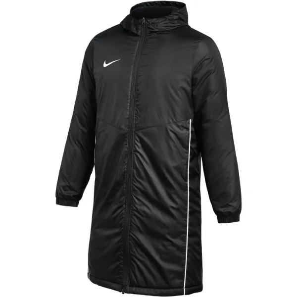 Effenkleurige herenwinterjas van het merk NIKE. Jas met het kenmerkende Swoosh-logo en capuchon. Wind- en waterafstotend materiaal.
