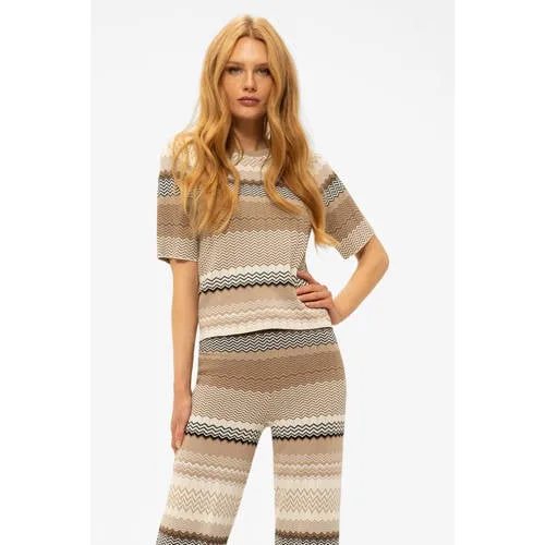 Deze lichtbruine Pilazio top van NIKKIE geeft je outfit direct een moderne, verzorgde uitstraling. De zachte tinten lichtbruin en ecru komen samen in een grafisch dessin dat duidelijk aanwezig is, maar rustig oogt. De fijngebreide stof met een subtiel glanzend draadje zorgt ervoor dat de NIKKIE top Pilazio een licht sprankelend effect heeft, terwijl de korte, rechte mouwen en ronde hals het model overzichtelijk en makkelijk te combineren maken.Bijzondere details in een draagbaar design Lichtbruin/ecru kleurcombinatie met grafische print voor een moderne uitstraling Korte, rechte mouwen die aansluiten bij de schouders Ronde hals die prettig rond de halslijn valt Gemaakt van een materiaal met viscose voor een soepele, zachte touch Subtiele metallic draad voor een lichte glans in het breisel Fijngebreide kwaliteit die gelijkmatig langs het lichaam valtStyling voor elke dag en de avondDe Pilazio top combineer je eenvoudig met een hoge jeans of een rechte pantalon voor een verzorgde dagelijkse outfit. Voor een avondmoment draag je de top met een rok en hakken. De grafische print en lichte glans maken de top geschikt voor zowel casual als meer geklede combinaties.NIKKIE: herkenbare stijl met een stoere randNIKKIE staat voor kleding met een vrouwelijke pasvorm en een herkenbare, stoere touch. De collecties sluiten aan bij het dagelijks leven, van werk tot etentje. Deze Pilazio top past binnen die signatuur, met aandacht voor details, materiaal en draagbaarheid.Een praktische basis die je garderobe overzichtelijk houdt en veelzijdige combinaties mogelijk maakt.