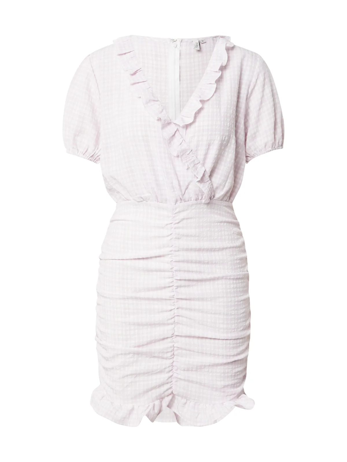 Design: Pofmouwen, Rug rits, Elastische inzetstukken; Type sluiting: Ritssluiting; Halstype: V-hals; Motief: Geruit; Details: Ruches, Gedrapeerd; Extra's: All-over patroon, Voelt zacht aan; Lengte: Kort/mini; Pasvorm: Slanke pasvorm; Armlengte: Kwartmouw