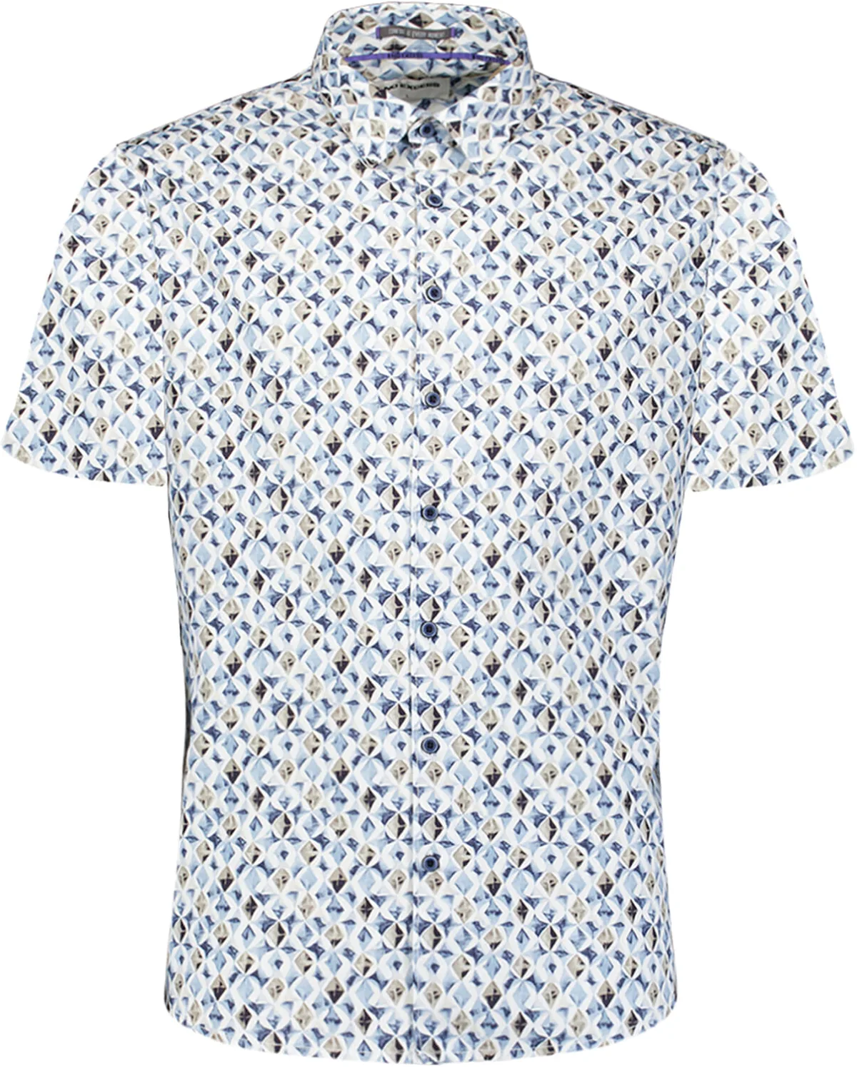 Overhemd Jersey Allover Print van No Excess is een casual overhemd met grafische print, spreidkraag en knoopsluiting. De regular pasvorm en korte mouwen dragen comfortabel en vallen netjes. De lichte basis met blauw, zand en grijs combineert makkelijk met een chino of short.