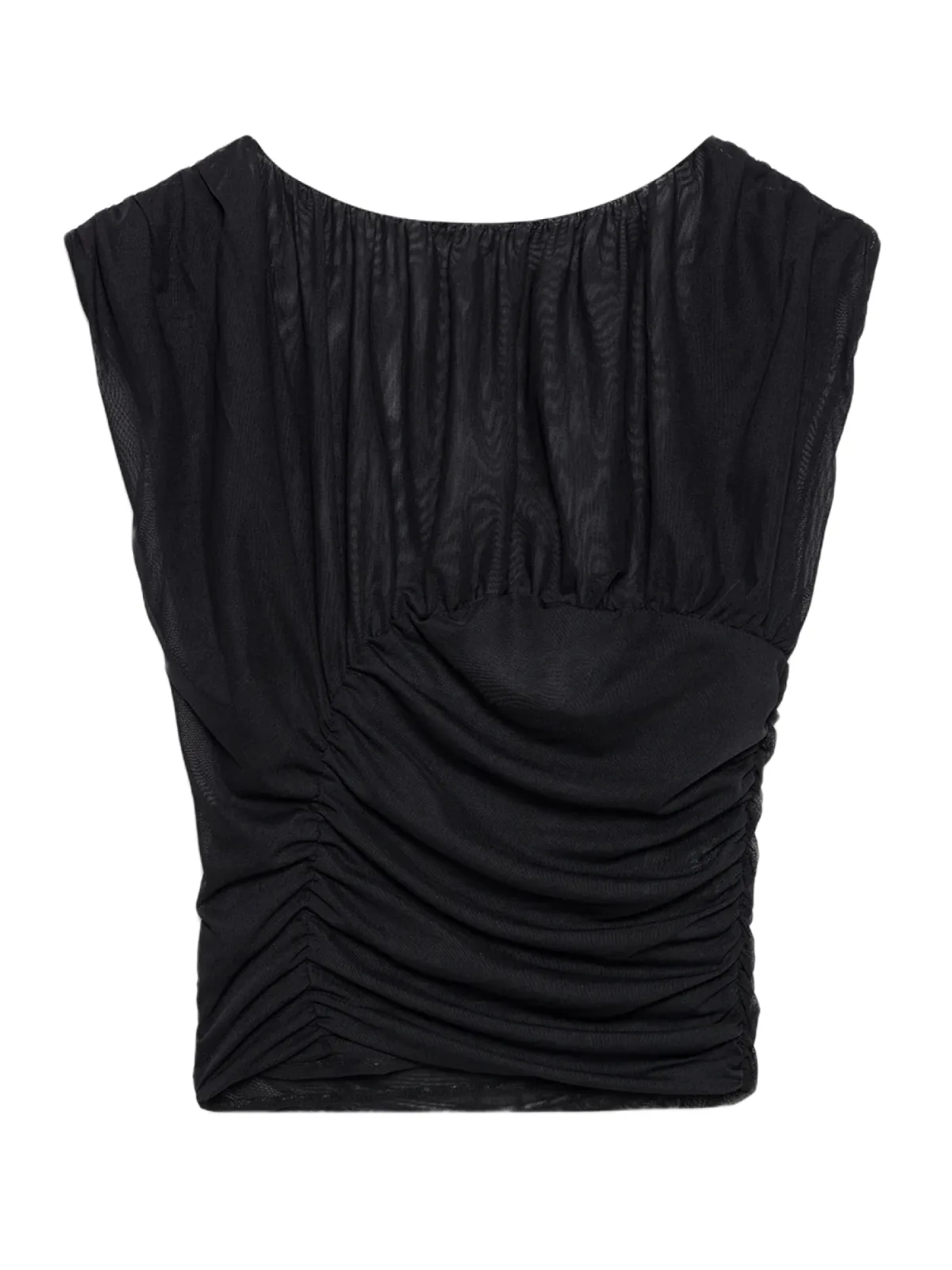 Blouse type: Blouseshirt; Design: Rechte zoom; Motief: Effen; Kraag: Zonder kraag; Details: Gedrapeerd; Extra's: Lichte stof; Pasvorm: Slanke pasvorm; Armlengte: Mouwloos; Lengte: Normale lengte