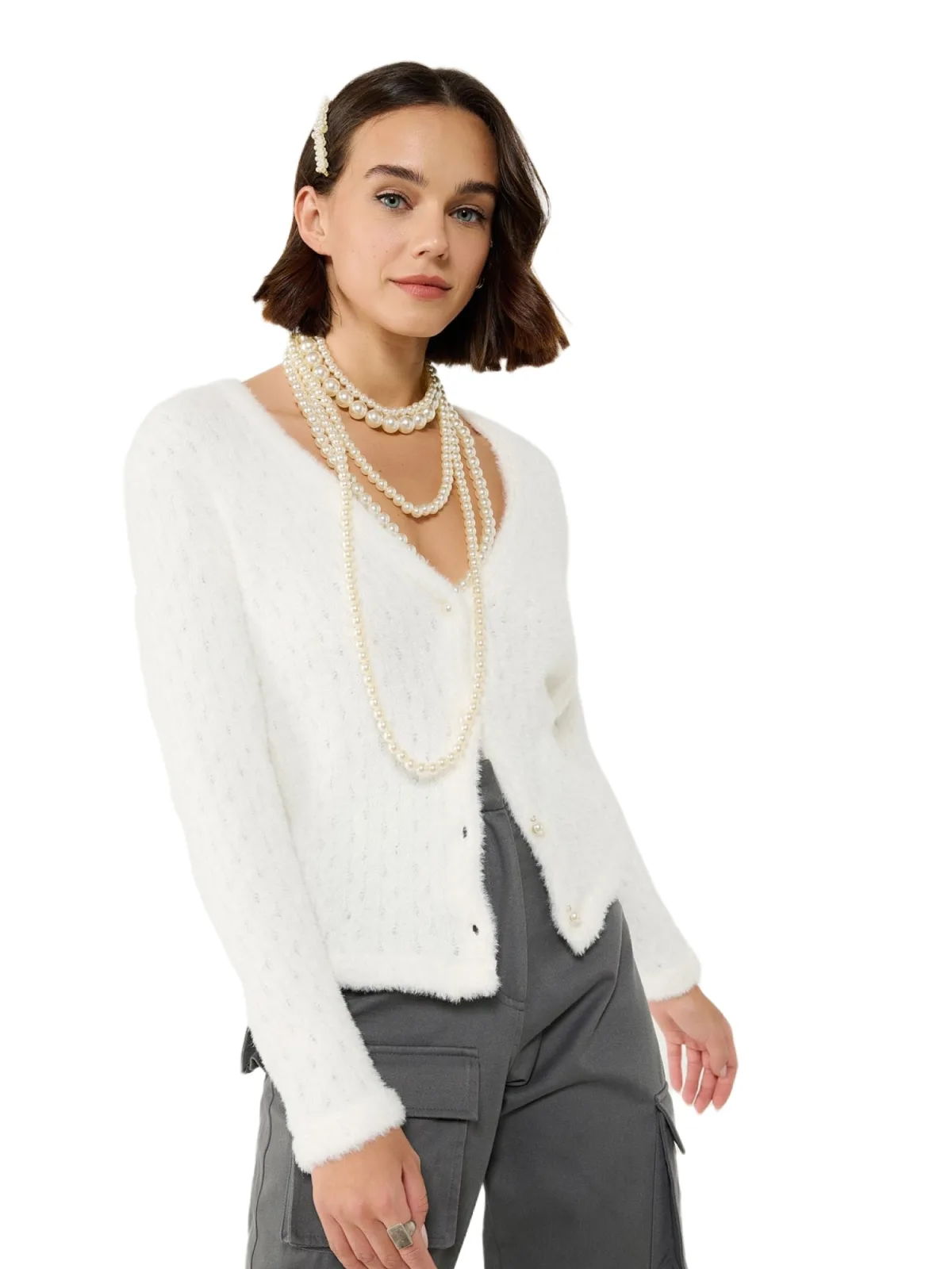 Design: Knop placket; Type sluiting: Knoopsluiting; Materiaal: Knitwear; Halstype: V-hals; Motief: Effen; Details: Mesh; Extra's: Voelt zacht aan; Pasvorm: Slanke pasvorm; Armlengte: Lange mouw; Lengte: Normale lengte