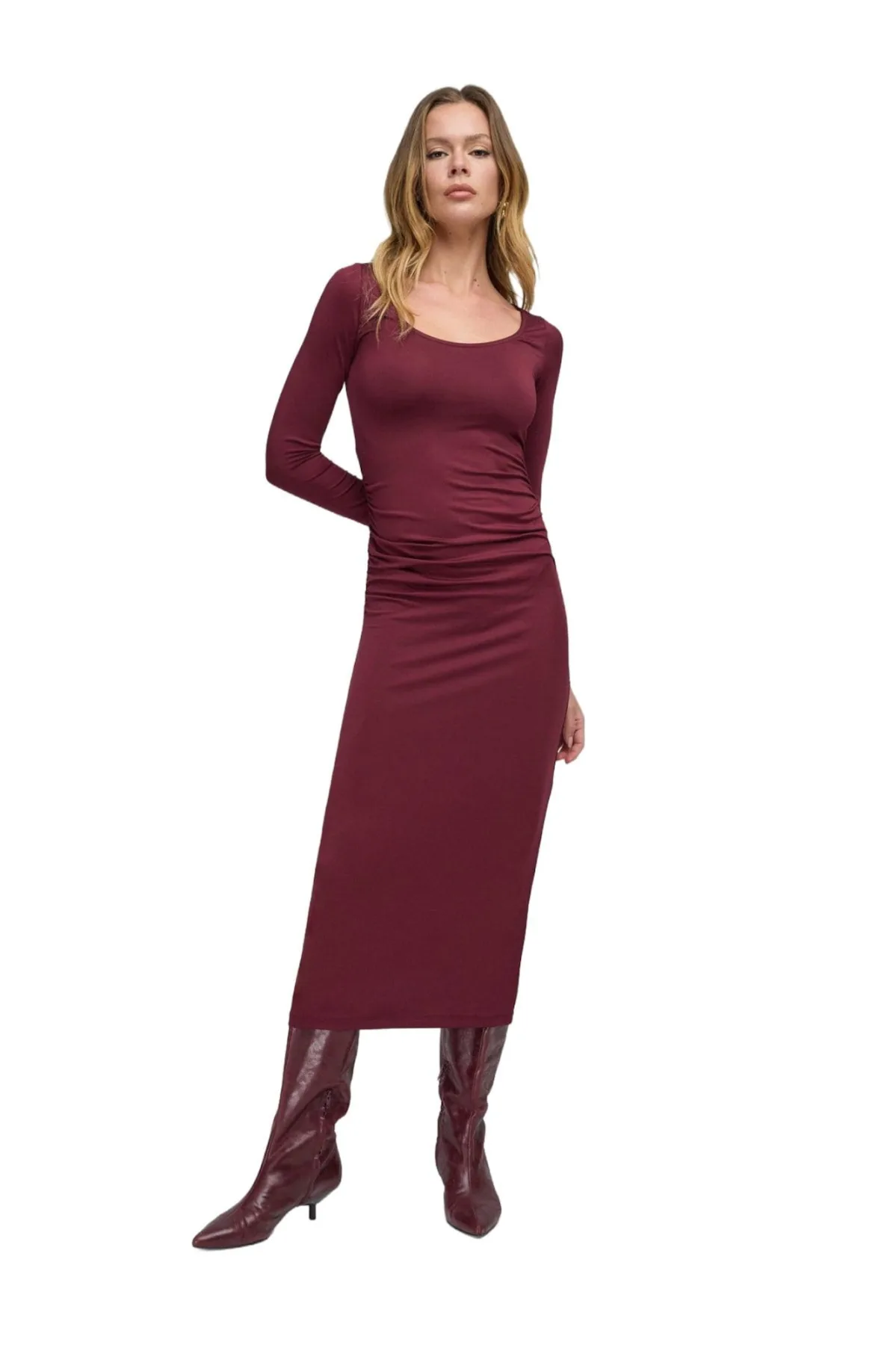 Design: Gevoerde zoom/rand; Materiaal: Jersey; Halstype: Ronde hals; Motief: Effen; Details: Gedrapeerd; Extra's: Op staal naden; Lengte: 7/8 lengte; Snit: Figuur omarmend; Pasvorm: Slanke pasvorm; Armlengte: Lange mouw