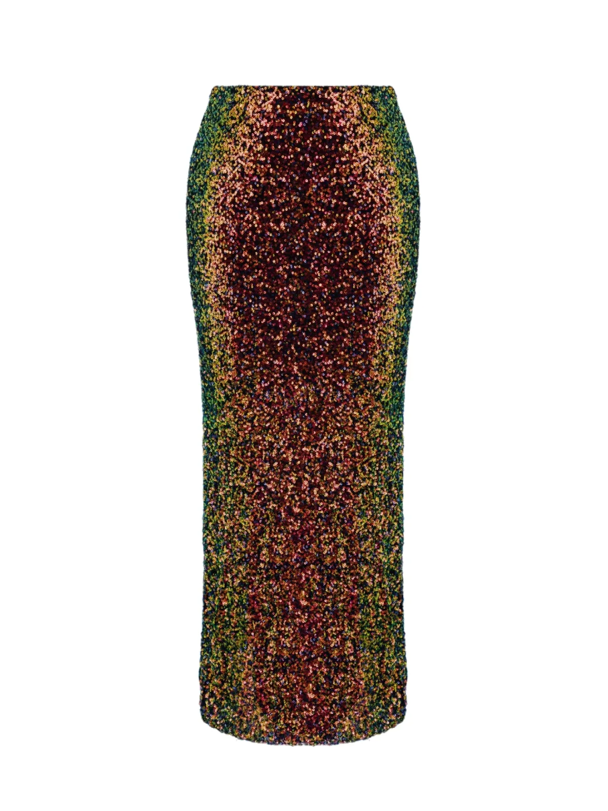 Design: Rechte zoom; Motief: Kleurverloop; Rokvorm: Kokerrok; Details: Pailletten; Extra's: All-over patroon; Lengte: 3/4 lengte; Pasvorm: Normale pasvorm