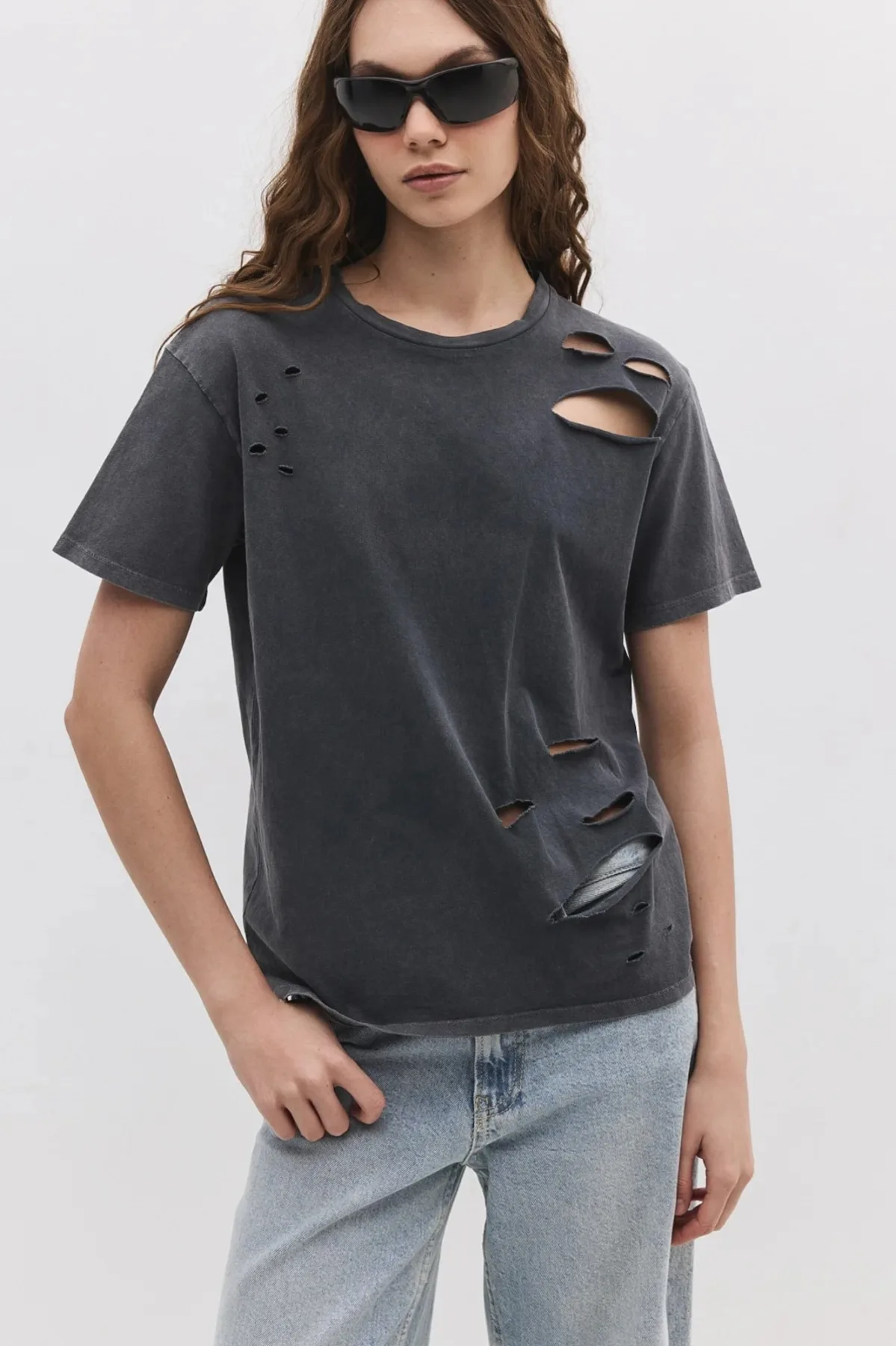 Design: Gevoerde zoom/rand, Overcut schouder; Materiaal: Jersey; Halstype: Ronde hals; Motief: Effen; Details: Cut-outs; Extra's: Used-look, Voelt zacht aan; Pasvorm: Losse pasvorm; Armlengte: Kwartmouw; Lengte: Normale lengte
