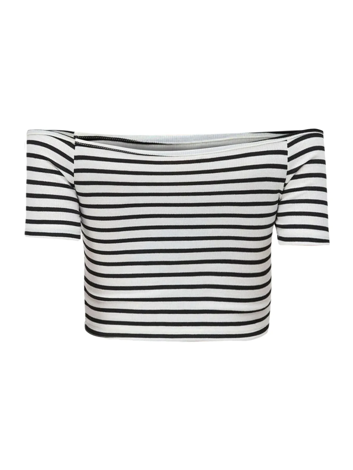 Materiaal: Jersey; Halstype: Carmen hals; Motief: Gestreept; Pasvorm: Slanke pasvorm; Armlengte: Kwartmouw; Lengte: Korte pasvorm