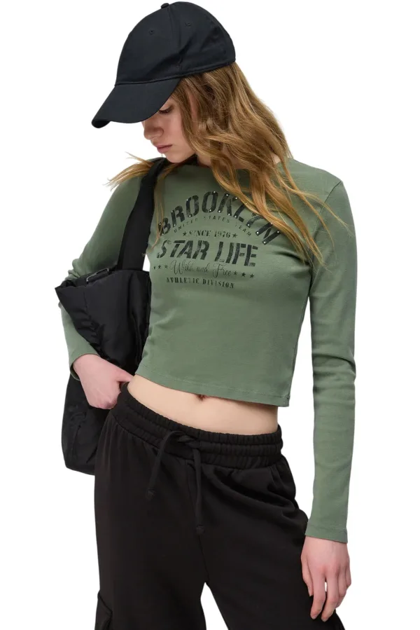 Design: Gevoerde zoom/rand, Geribd ceintuurtje; Type sluiting: Slip; Materiaal: Jersey; Halstype: Ronde hals; Motief: Tekst print; Extra's: Studs, Op staal naden; Pasvorm: Slanke pasvorm; Armlengte: Lange mouw; Lengte: Korte pasvorm