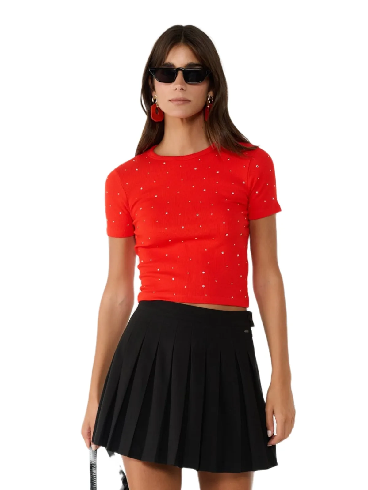 Design: Geribbelde kraag, Rechte zoom; Materiaal: Jersey; Halstype: Ronde hals; Details: Sierstenen; Extra's: Applicaties, Voelt zacht aan; Pasvorm: Slanke pasvorm; Armlengte: Kwartmouw; Lengte: Korte pasvorm