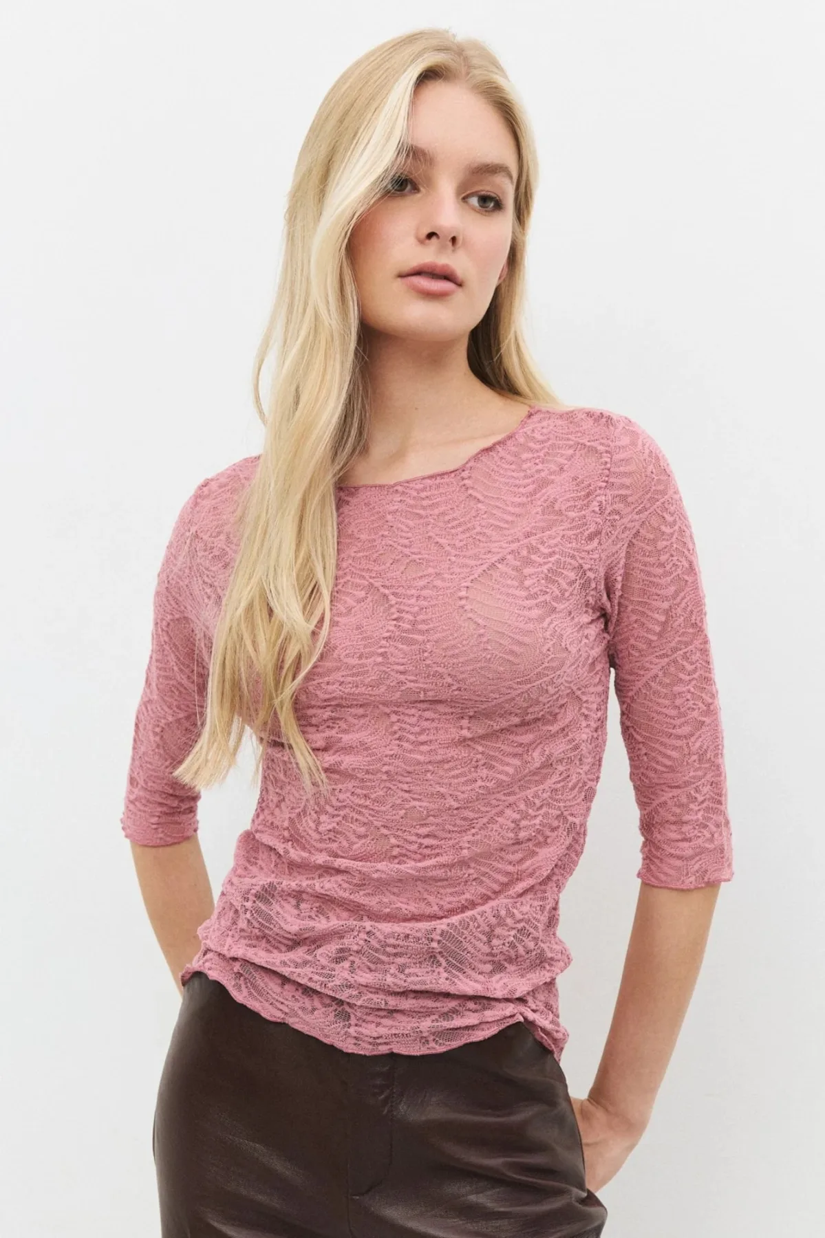 Design: Gerolde boord; Materiaal: Katoen; Halstype: Ronde hals; Motief: Effen; Details: Kant; Extra's: Licht transparant, Met textuur; Pasvorm: Normale pasvorm; Armlengte: Halve mouw; Lengte: Normale lengte