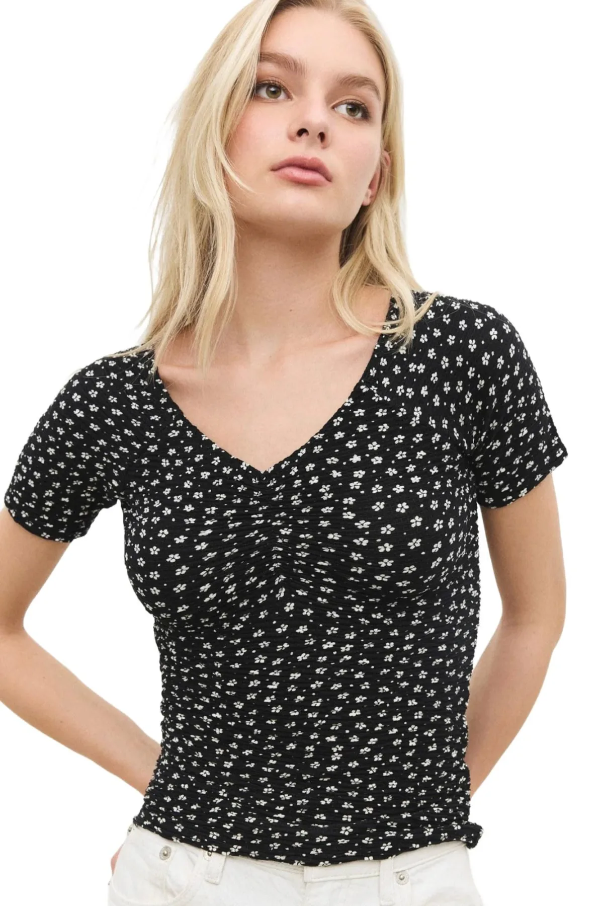 Materiaal: Jersey; Halstype: V-hals; Motief: Bloemenprint; Details: Gedrapeerd; Extra's: All-over patroon; Pasvorm: Normale pasvorm; Armlengte: Kwartmouw; Lengte: Normale lengte