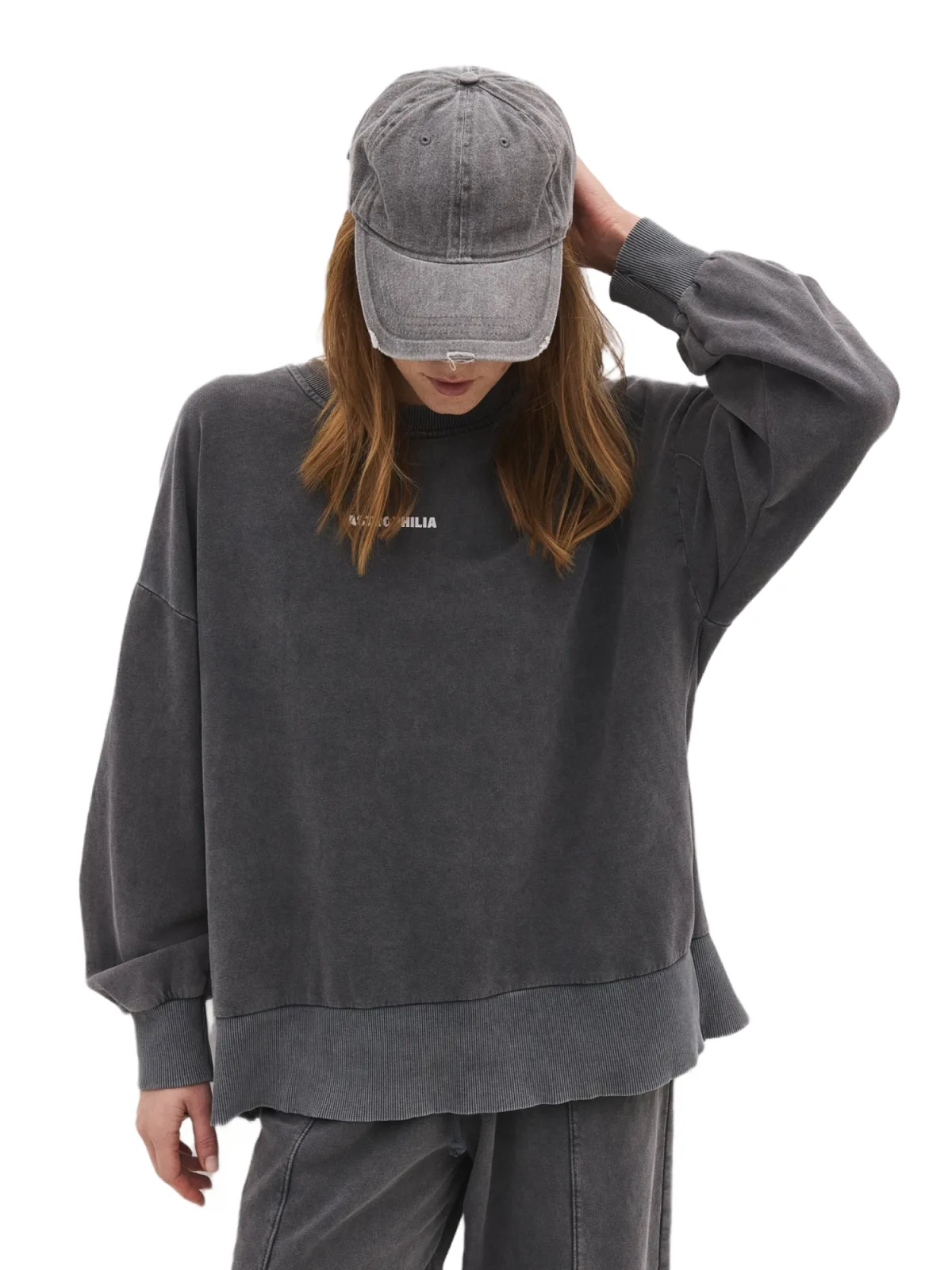 Design: Geribd ceintuurtje, Overcut schouder; Materiaal: Sweatstof; Halstype: Ronde hals; Motief: Tekst print; Extra's: Studs, Gewassen effect, Voelt zacht aan; Pasvorm: Losse pasvorm; Armlengte: Lange mouw; Lengte: Normale lengte