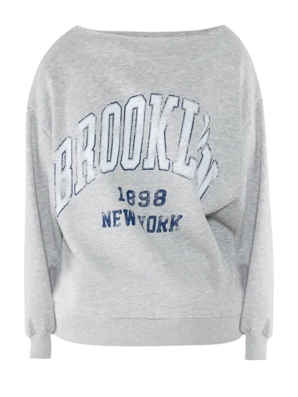 Design: Geribd ceintuurtje; Materiaal: Sweatstof; Halstype: Boothals; Motief: Tekst print; Details: Gedrapeerd; Extra's: Op staal naden; Pasvorm: Losse pasvorm; Armlengte: Lange mouw; Lengte: Normale lengte