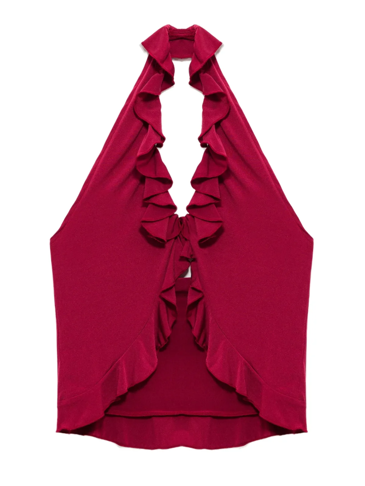 Blouse type: Blouseshirt; Design: Gerolde boord, Diepe snit/decolleté, Uitgesneden rug; Materiaal: Jersey; Halstype: V-hals; Motief: Effen; Kraag: Zonder kraag; Soort bandjes: Haltermodel; Details: Cut-outs, Ruches; Extra's: Op staal naden, Gladde stof; Pasvorm: Slanke pasvorm; Armlengte: Mouwloos; Lengte: Korte pasvorm