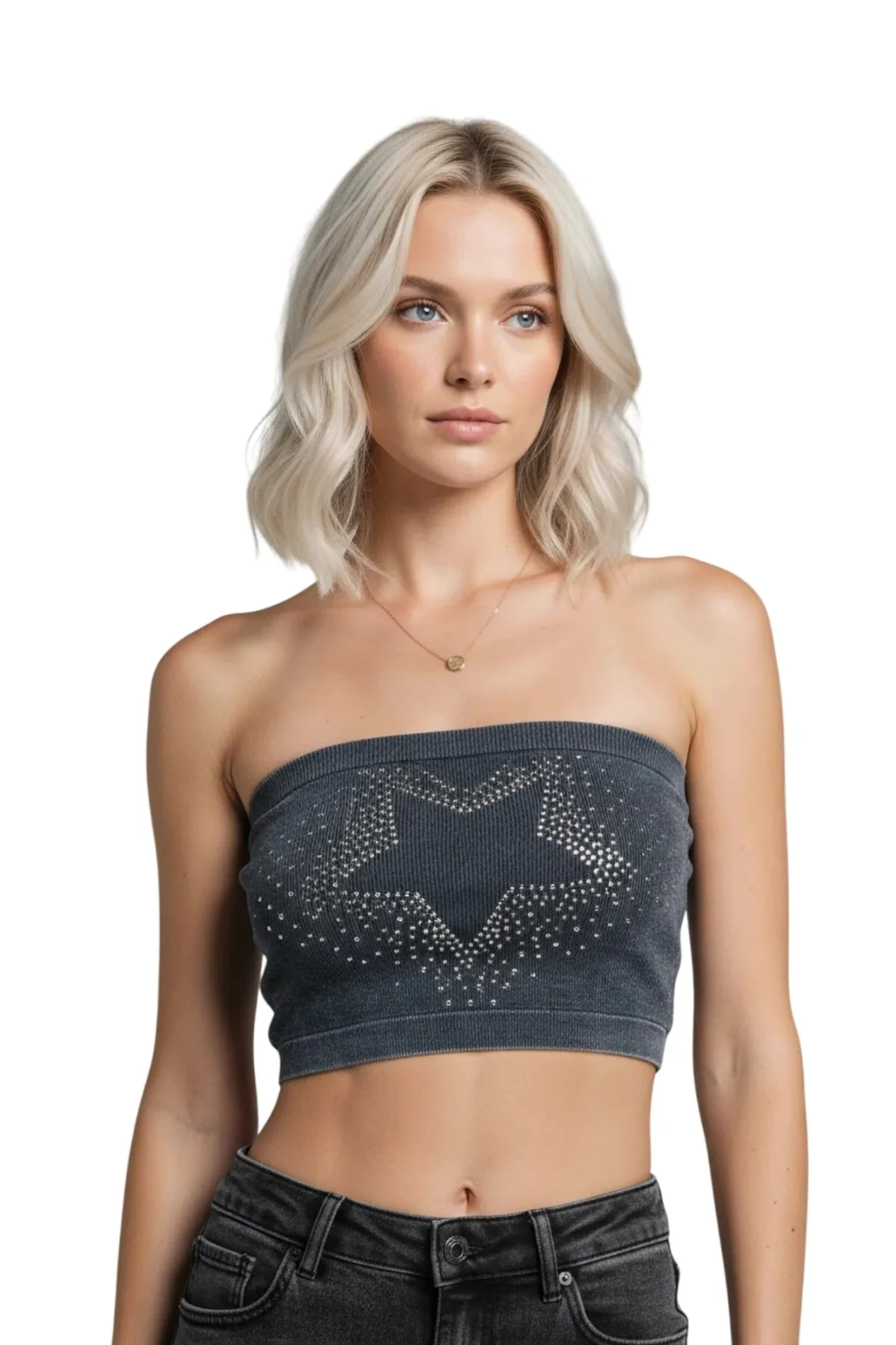 Design: Rechte zoom; Materiaal: Jersey; Motief: Motiefprint; Soort bandjes: Bandeau; Details: Sierstenen; Extra's: Met halfedelstenen; Pasvorm: Slanke pasvorm; Armlengte: Mouwloos; Lengte: Korte pasvorm