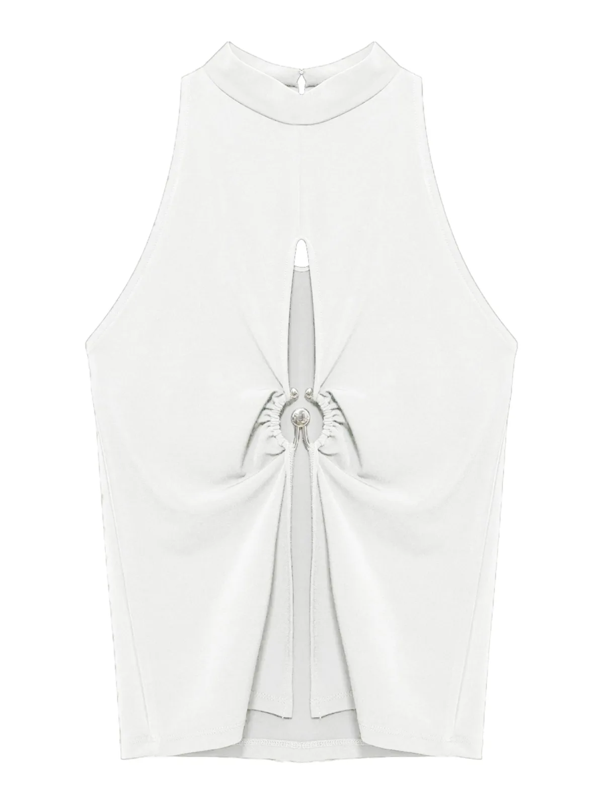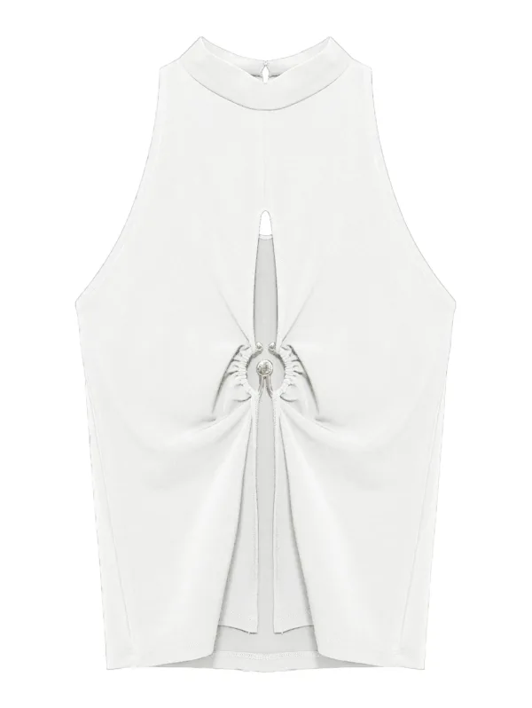 Blouse type: Blouseshirt; Design: Gevoerde zoom/rand; Materiaal: Jersey; Halstype: Opstaande kraag; Motief: Effen; Kraag: Zonder kraag; Soort bandjes: Haltermodel; Details: Cut-outs, Gedrapeerd; Extra's: Op staal naden; Pasvorm: Aansluitende pasvorm; Armlengte: Mouwloos; Lengte: Normale lengte