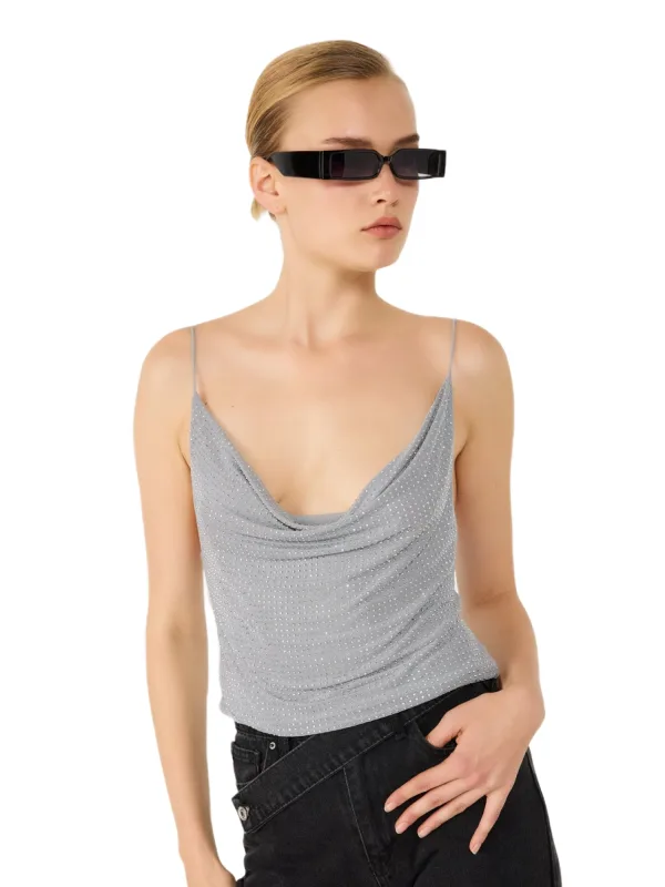 Design: Gevoerde zoom/rand; Materiaal: Jersey; Halstype: Watervalhals; Motief: Effen; Soort bandjes: Spaghettibandjes; Details: Sierstenen; Extra's: Op staal naden; Pasvorm: Normale pasvorm; Armlengte: Mouwloos; Lengte: Normale lengte