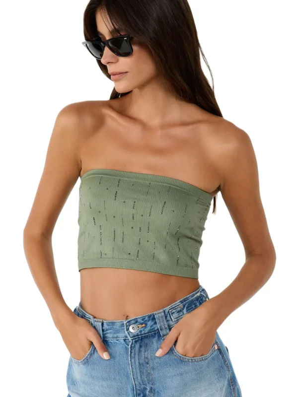 Design: Rechte zoom; Materiaal: Jersey; Soort bandjes: Bandeau; Details: Sierstenen; Extra's: Glitterend, Applicaties, Op staal naden; Pasvorm: Aansluitende pasvorm; Armlengte: Mouwloos; Lengte: Korte pasvorm
