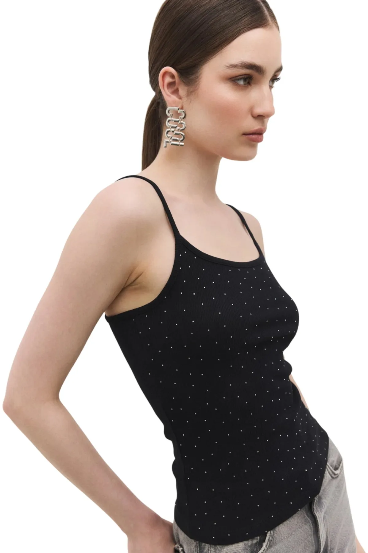 Design: Gevoerde zoom/rand; Materiaal: Jersey; Halstype: Ronde hals; Motief: Effen; Soort bandjes: Spaghettibandjes; Extra's: Glitterend; Pasvorm: Slanke pasvorm; Armlengte: Mouwloos; Lengte: Normale lengte